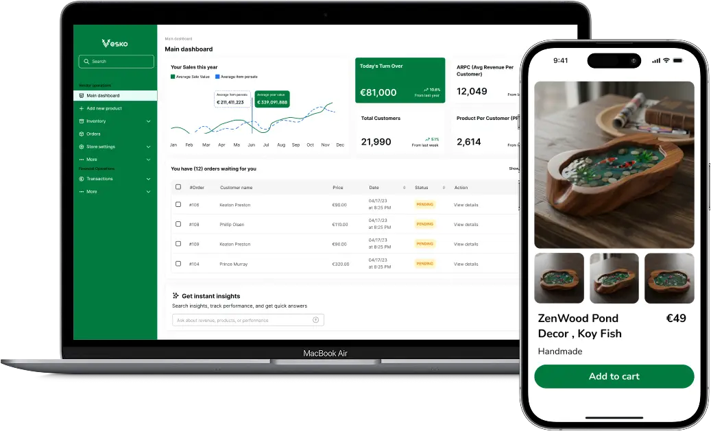 Get your store online in a few clicks. Register, list your products, and Vesko takes care of the rest, storefront, payments, and logistics are ready and integrated